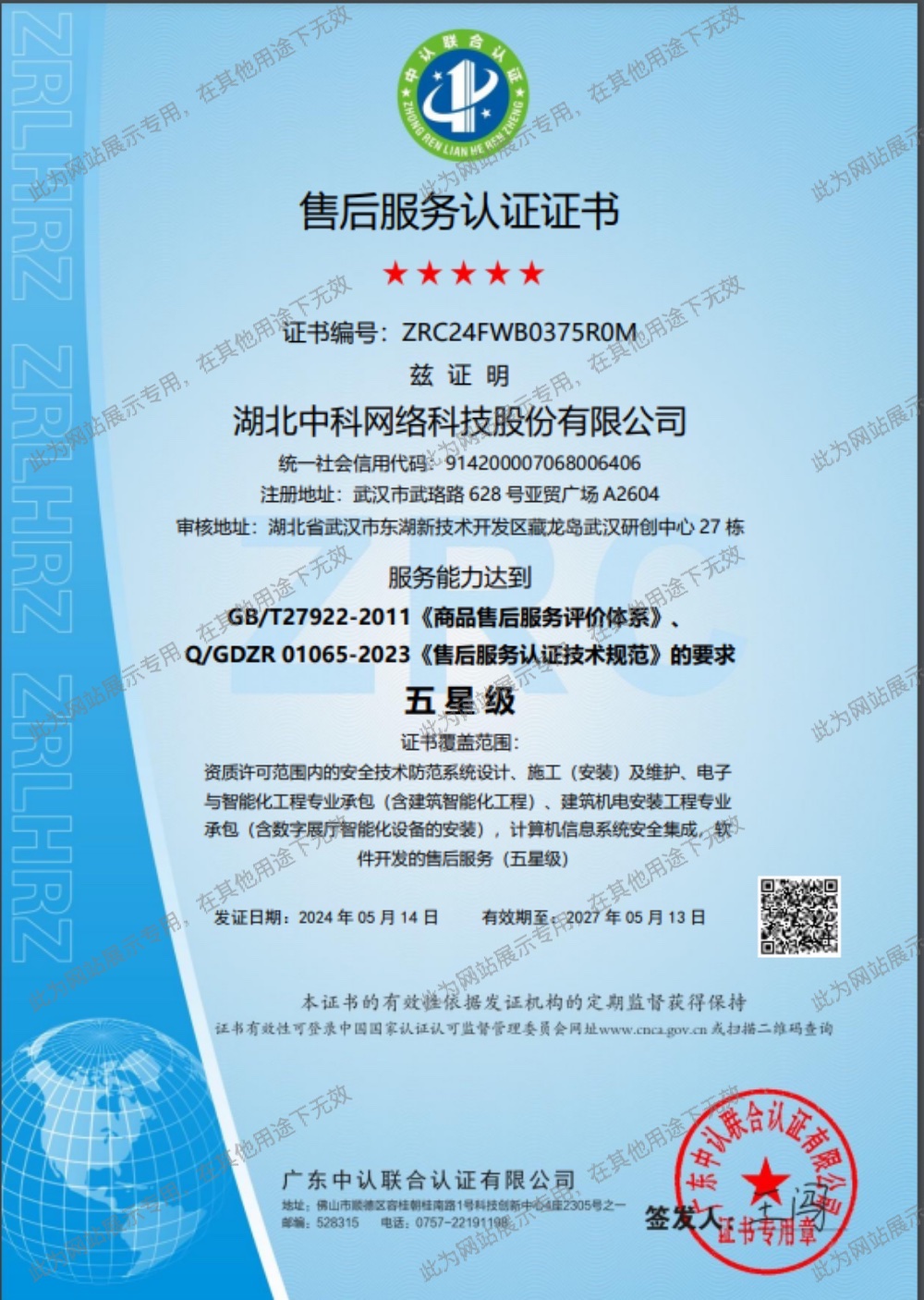 • 五星級售后服務認證證書